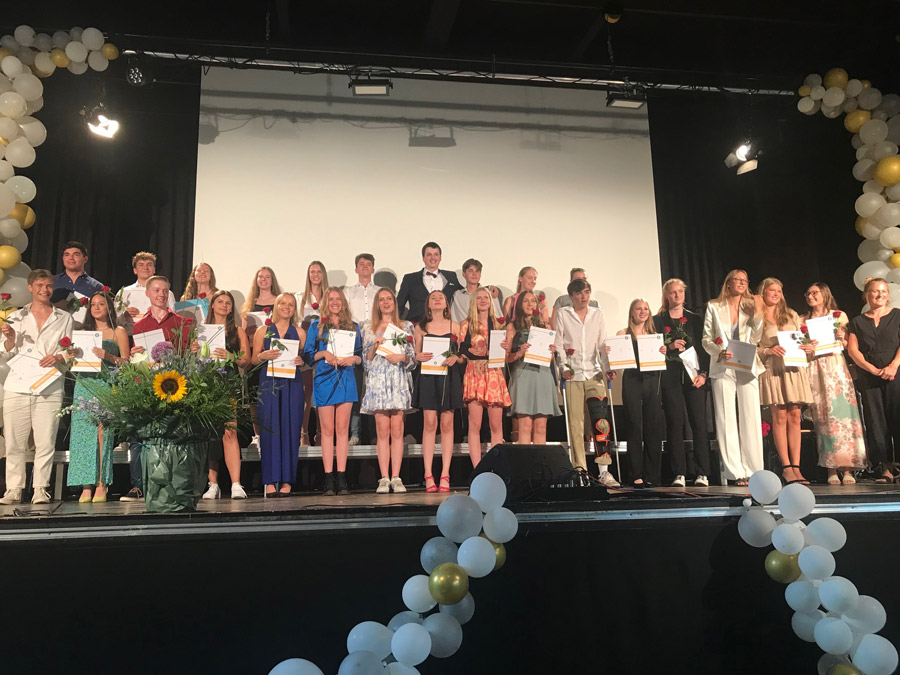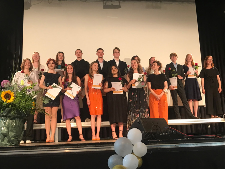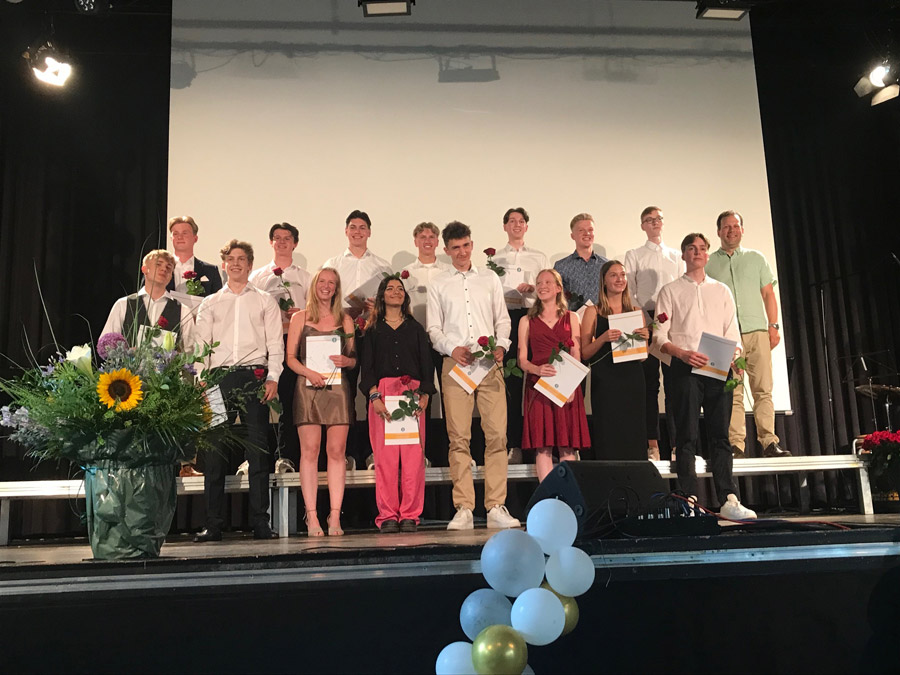 4 x die Traumnote 1,0 (Jona Will, Fabian Slack, Greta Oesterlin und Kira Mueller-Bürow), 19 x die 1 vor dem Komma – ein Abischnitt von 2,1. Und zum ersten Mal seit drei Corona-Jahren eine Feier im eigenen Haus. Ein tolles Programm, ein besonderer Jahrgang und ein fröhliches Tschüß!