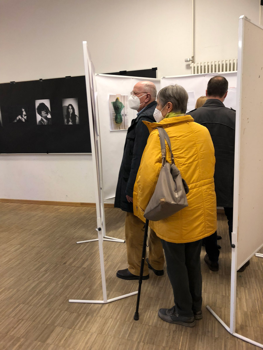 Frau Brakutt eröffnete die Ausstellung mit dem Hinweis auf die Vielfalt der Ergebnisse, so gab es unter anderem die Abschlussprojekte zum Thema „Mensch“ des Kunstprofils zu sehen, sowie Kurzfilmprojekte zum Thema „Heimat“ aus dem Bereich Theater. Begleitet wurde die Ausstellungseröffnung durch Beiträge der SchülerInnen des Musikprofils. Die zweistündige Blitzausstellung war gut besucht. Das soziale Projekt organisierte einen Getränkeverkauf und sorgte für die Erfrischung der Gäste.