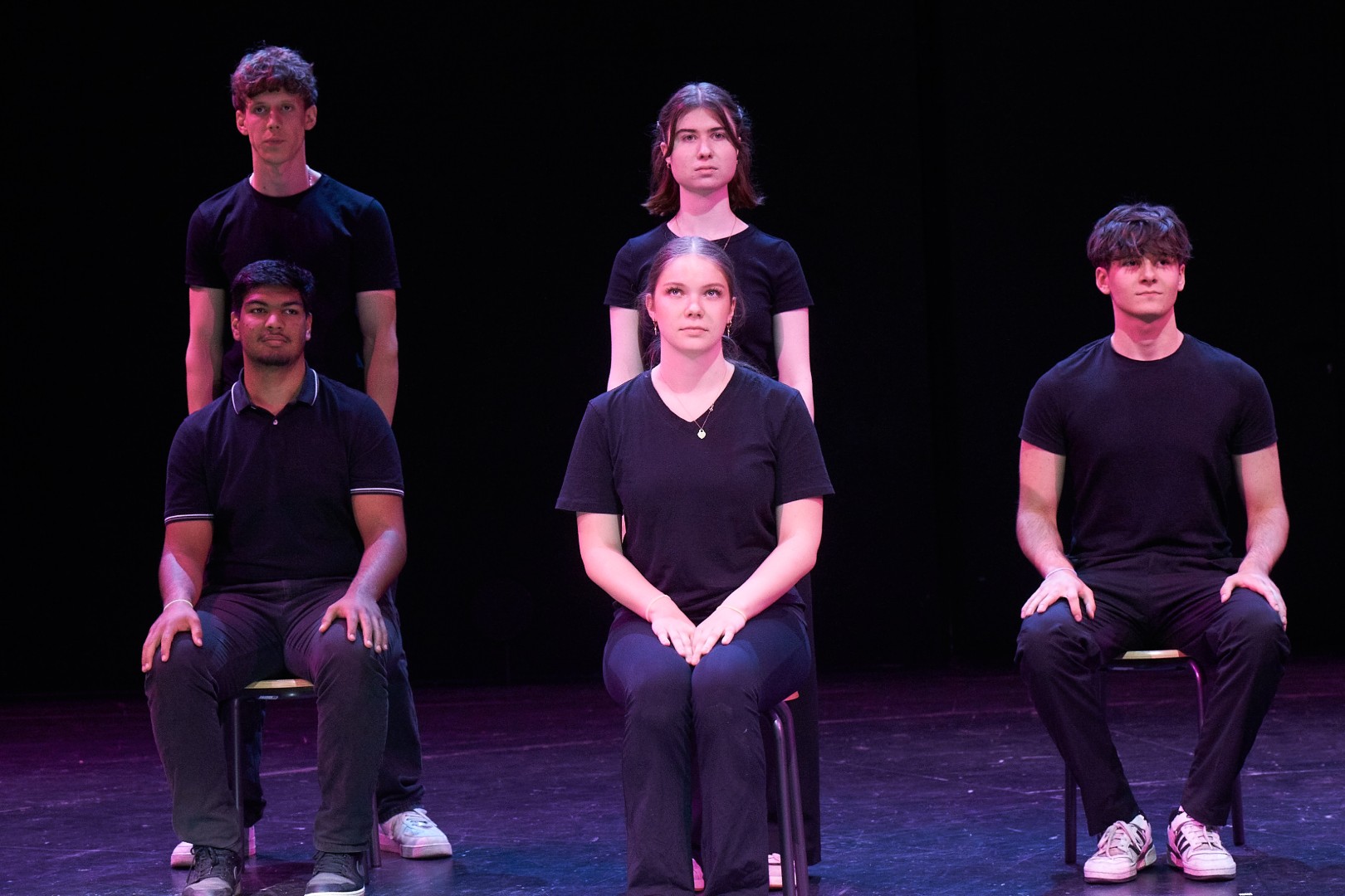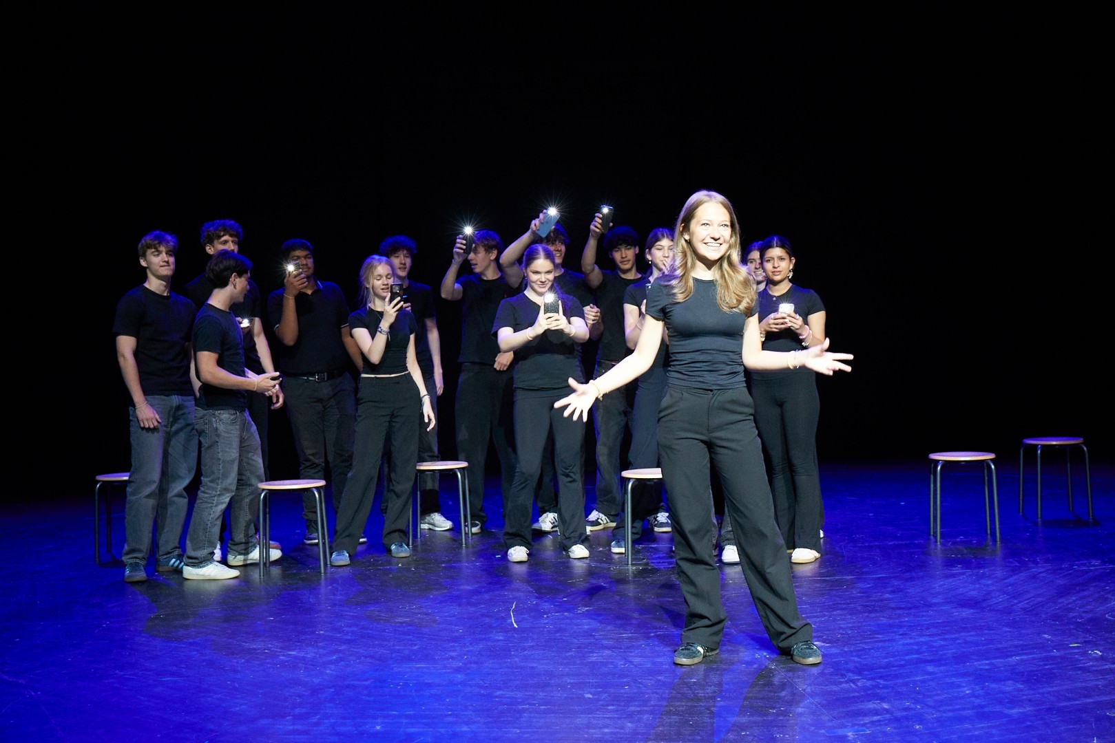 „Was bedeutet eigentlich Glück – und wie wird man überhaupt glücklich? Welche Rolle spielen Tiktok, Insta und Co und wie beeinflusst social Media unsere Vorstellungen von einem perfekten Leben? Um Antworten darauf zu finden, ließen wir uns an der Arbeit des Choreographen Sadeck Waff sowie an Textbausteinen aus Falk Richters Werken inspirieren. Entstanden ist eine szenische Collage, mit der wir den Zwiespalt zwischen medialen Schein und jugendlicher Realität beleuchten und kritisch hinterfragen.“ (Jette aus dem Kurs von Frau Brandsdörfer)