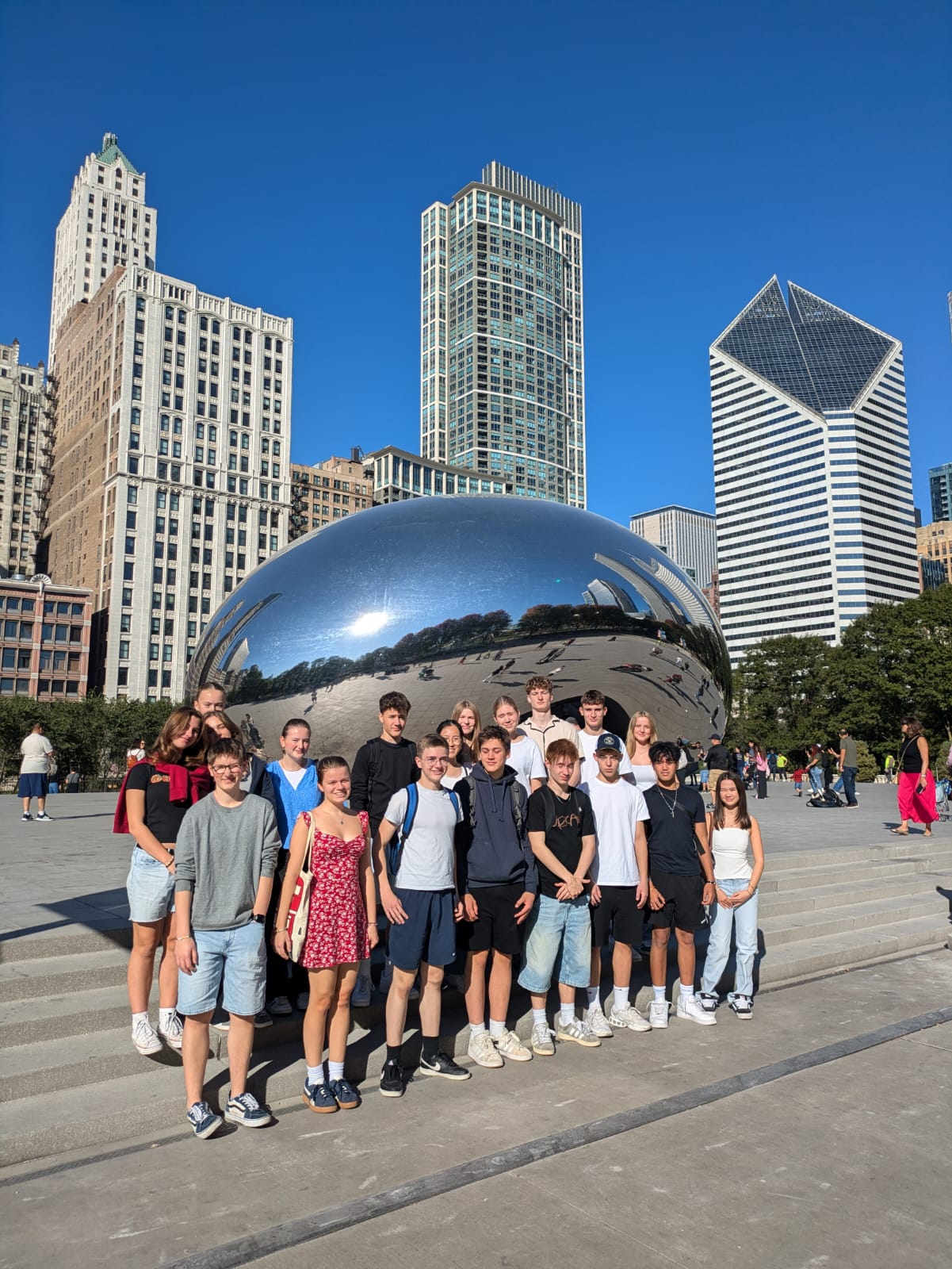 Nach dem Einchecken im Getaway Hostel stand ein gemeinsamer Abend mit Einkaufen und Kochen an, um die vergangenen Wochen gemeinsam Revue passieren zu lassen. Am nächsten Tag ging es dann ins berühmte Art Institute, wo die Gruppe an einer „Art and Activism“-Tour speziell für Schulklassen teilnehmen konnte. Auf einem Foto steht die Gruppe vor einem berühmten Wahrzeichen der Stadt: The Bean (offiziell Cloud Gate) im Millennium Park. Anschließend erkundeten die Schüler:innen in Kleingruppen Chicago.