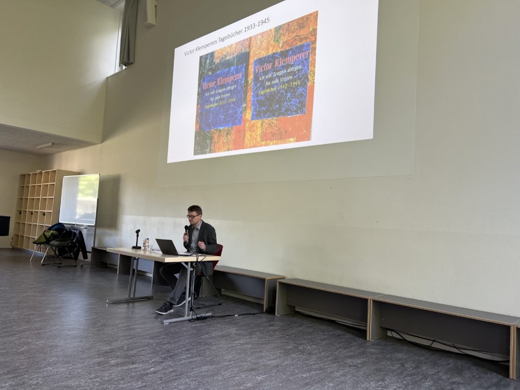 Am Donnerstag, den 08.05.25, fand für den 10. Jahrgang eine Lesung von Dr. Renatus Deckert aus den Tagebüchern von Victor Klemperer, einem Überlebenden des Holocaust, statt. Am 80. Jahrestag der bedingungslosen Kapitulation der Wehrmacht und dem Ende des 2. Weltkrieges auf dem europäischen Kontinent sollte mit dieser Veranstaltung auf die verheerenden Folgen einer rassistischen und antisemitischen Politik sowie die Lebenswirklichkeit in einer menschenverachtenden Diktatur aufmerksam gemacht werden. In seinen Aufzeichnungen, die 1995 unter dem Titel „Ich will Zeugnis ablegen bis zum letzten (1933-1945)“ veröffentlicht wurden, schildert Victor Klemperer die systematische Diffamierung und Ausgrenzung, die er als Mensch jüdischer Herkunft im nationalsozialistischen Deutschland erleiden musste. Die zunehmende Radikalisierung der antisemitischen Politik, die in der Ermordung von 6 Millionen Jüdinnen und Juden mündete, wurde den Schülerinnen und Schüler durch verschiedenen Einträge Klemperers aus den Jahren 1933 bis 1945 verdeutlicht. Der Aufruf zum Boykott jüdischer Geschäfte, das Berufsverbot für jüdische Menschen, die Zwangskennzeichnung durch einen „Judenstern“ sowie die ständige Angst vor Gestapo-Verhören sind nur einige wenige Beispiele. Die Ehe mit einer „arischen“ Frau sowie die schweren Luftangriffe auf Dresden, die einen Tag vor seiner angeordneten Deportation stattfanden, retteten sein Leben. Die Schülerinnen und Schüler bewiesen mit ihren klugen und empathischen Fragen großes Interesse an diesem Thema.
