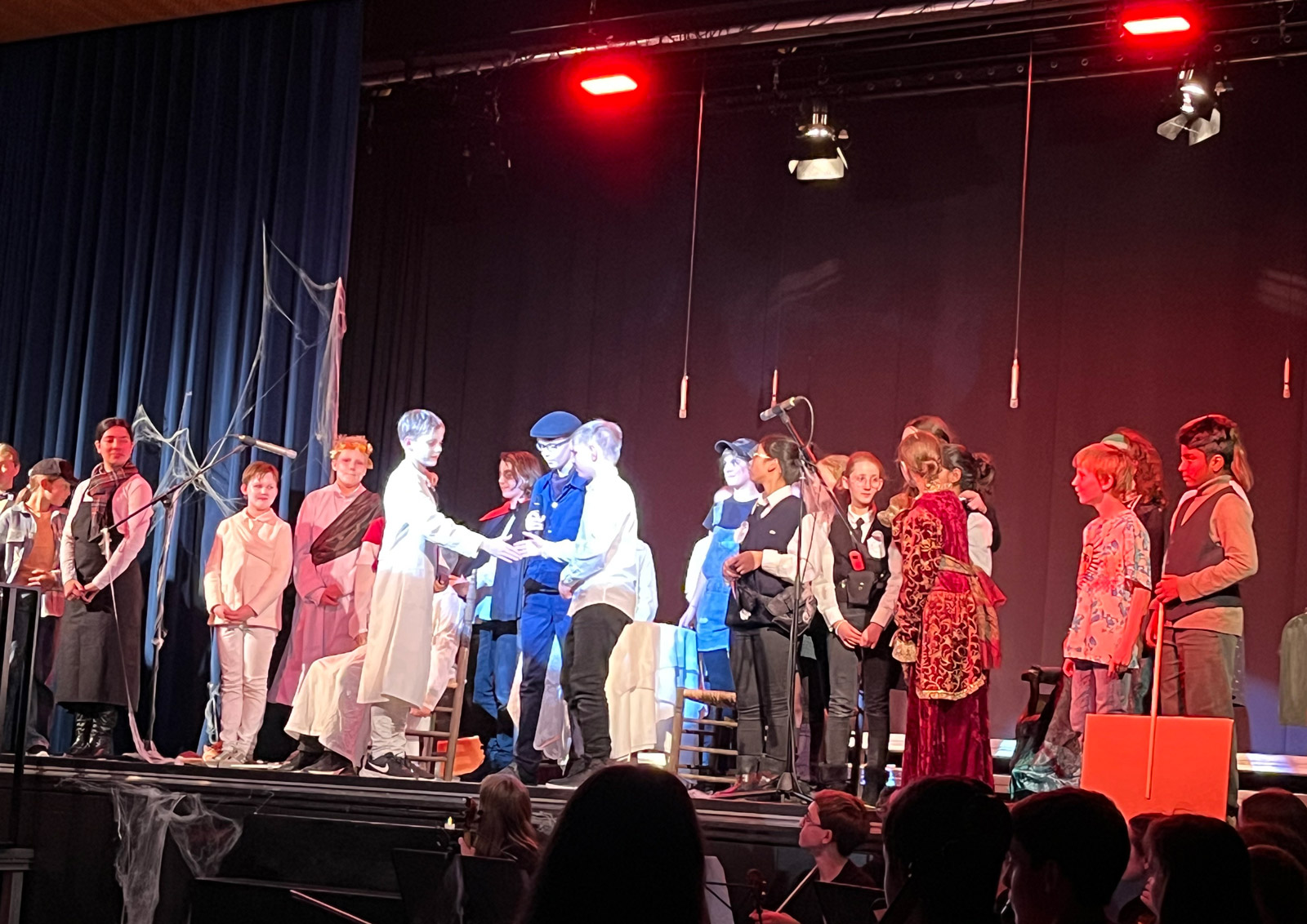 Am ersten Abend waren wir ganz schön nervös, denn die Aula war voll. Es hat aber alles sehr gut geklappt und mit der Versöhnung von Menschheit und Geisterwelt und großem Applaus endete unser Stück.