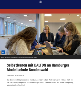 Der Beitrag „Selbstlernen mit DALTON an Hamburger Modellschule Bondenwald“ von NDR Kultur am 29.01.2026 zum Hören als Download (MP3).