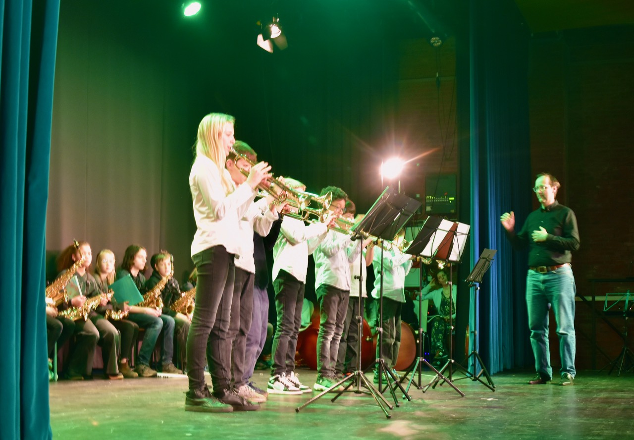 An Gitarren, Geigen, Bratschen, Celli, Kontrabässen, Harfen, Schlaginstrumenten, Querflöten, Klarinetten, Saxophonen und Trompeten zeigten die Schülerinnen und Schüler der Klassen 5/6 (und 7), was man mit etwas Elan schon nach kurzer Zeit auf die Bühne bringen kann.